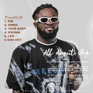 Nigeria Singer , Don S , The CEO DON S MUSIC ENTERTAINMNET & ENTERPRENEUR Present Most Anticipated EP , With Over 6 Tracks ,  Title All About Her , Containing , I DEY PRAY , SHE , ERIMA, YOUR BODY , IFEOMA, GOD DEY All songs written and compose by Don S  , Download and share , i bet you will never request your data back