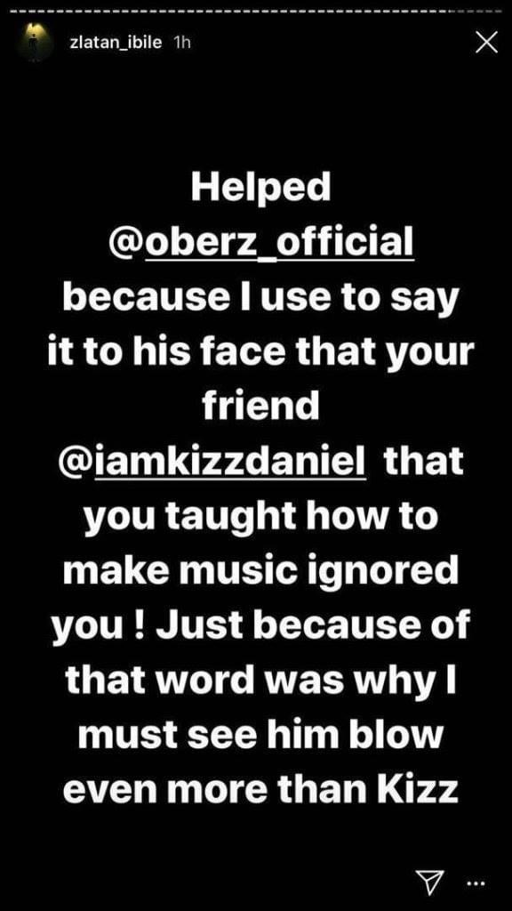 Zlatan continued; “He helped Oberz-official because I used to say it to his face that your friend @iamkizzdaniel that you thought how to make music ignored you! Just because of that word was why I must see him blow morethan Kizz”