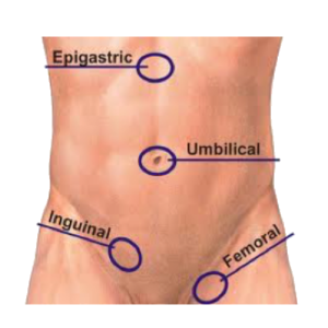 - Epigastric hernia- this is when fat or omentum pushes out through the weak wall of the abdomen between the umbilicus (belly button), sternum and forms a lump.